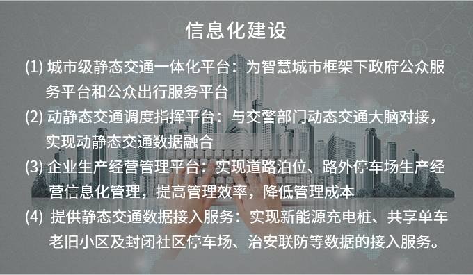 (1)城市級靜態(tài)交通一體化平臺:為智慧城市框架下政府公眾服務平臺和公眾出行服務平臺。 (2)動靜態(tài)交通調度指揮平臺:與交警部門動態(tài)交通大腦對接,實現(xiàn)動靜態(tài)交通數(shù)據(jù)融合。 (3)企業(yè)生產經營管理平臺:實現(xiàn)道路泊位、路外停車場生產經營信息化管理,提高管理效率,降低管理成本。 (4)提供靜態(tài)交通數(shù)據(jù)接入服務:實現(xiàn)新能源充電樁、共享單車、老舊小區(qū)及封閉社區(qū)停車場、治安聯(lián)防等數(shù)據(jù)的接入服務。