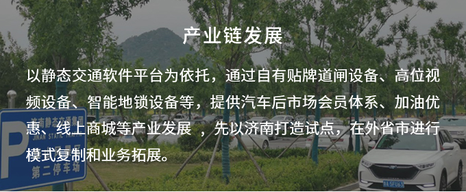以靜態(tài)交通軟件平臺為依托,通過自有貼牌道閘設備、高位視頻設備、智能地鎖設備等,提供汽車后市場會員體系、加油優(yōu)惠、線上商城等產業(yè)發(fā)展 , 先以濟南 打造試點,在外省市進行模式復制和業(yè)務拓展。